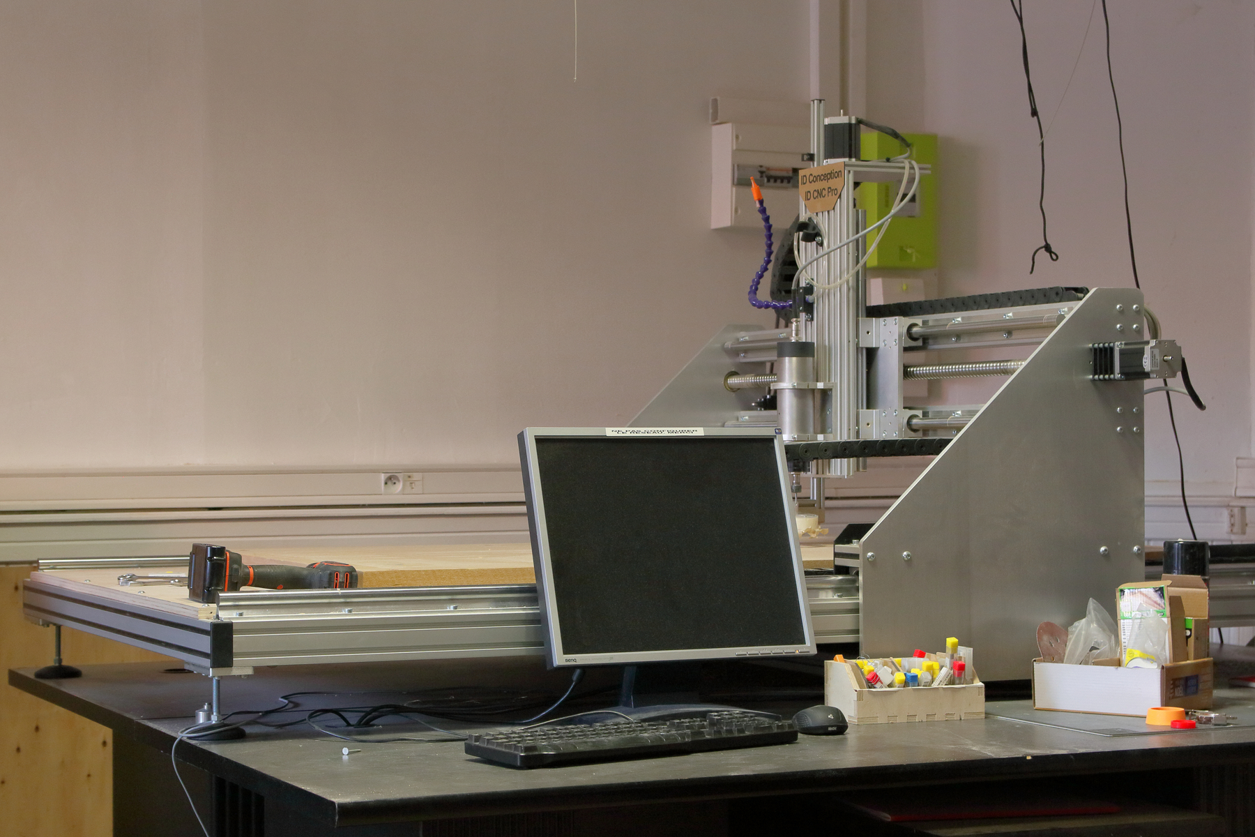 Dans le petit meuble blanc marqué CNC, vous trouverez: - les mèches - les vis de fixation